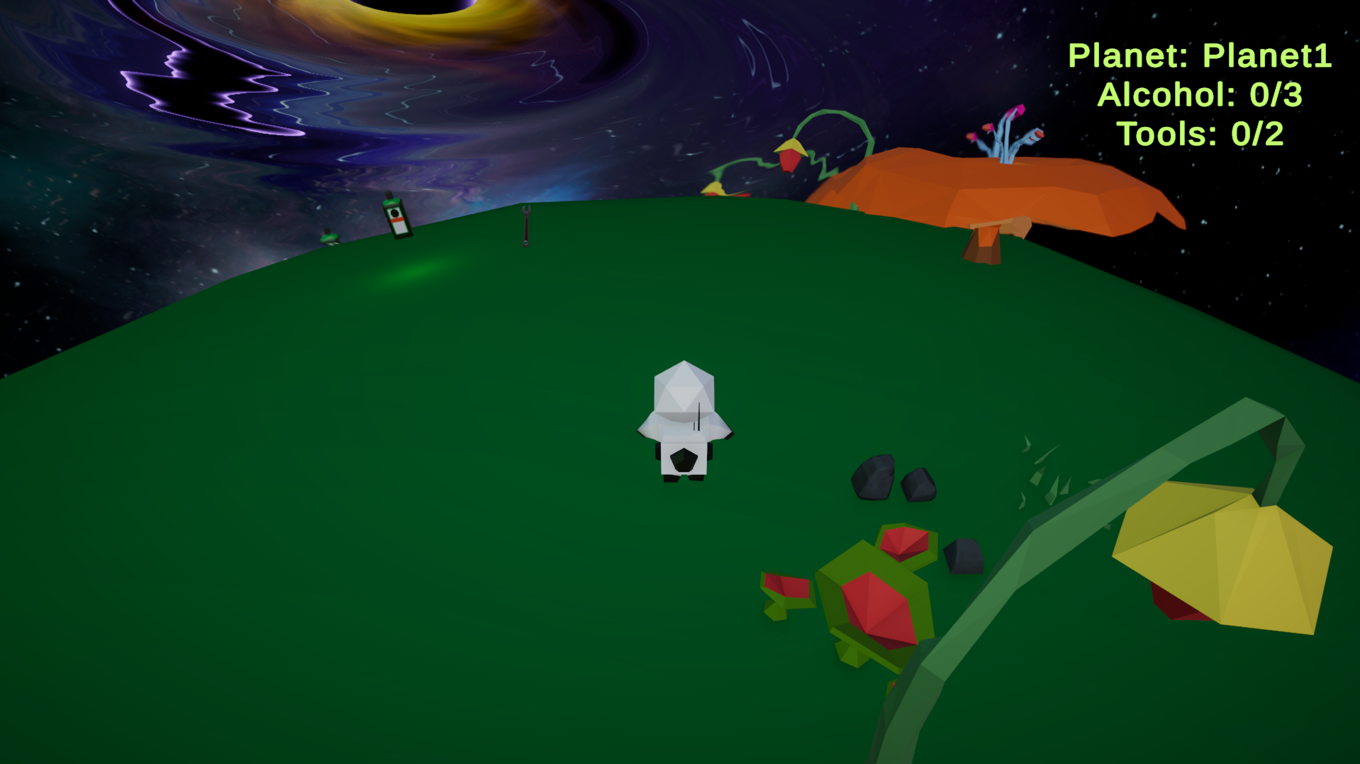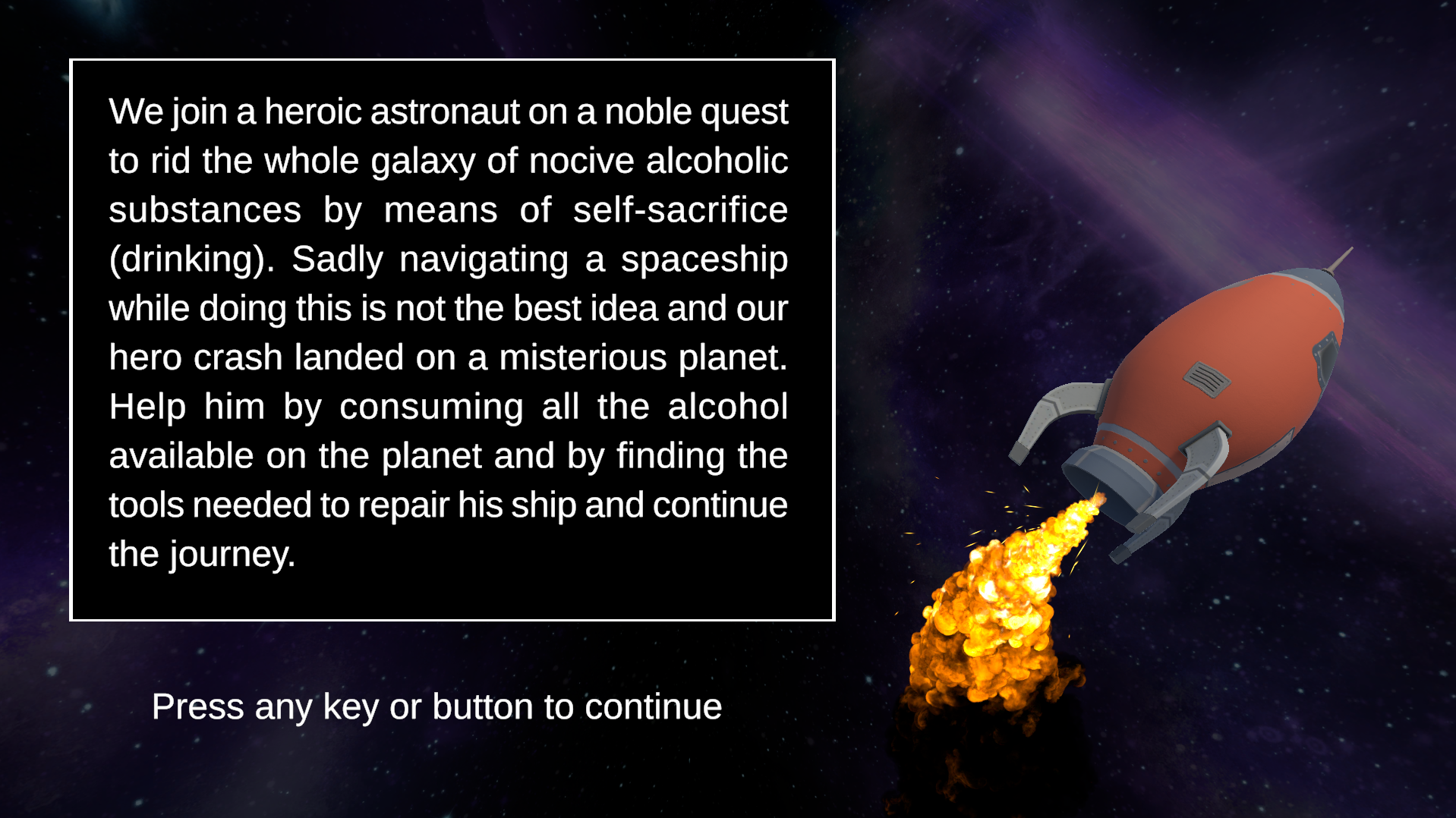 Take a walk across planets in a low poly solar system as you take control of a drunk astronaut who crash-lands on alien worlds in search of booze and tools to fix his ship. Repair your vessel, scavenge for spirits, and blast off—only to crash again in a drunken spiral of interstellar mayhem. Can you stay buzzed enough to keep going… or will the stars finally sober you up?